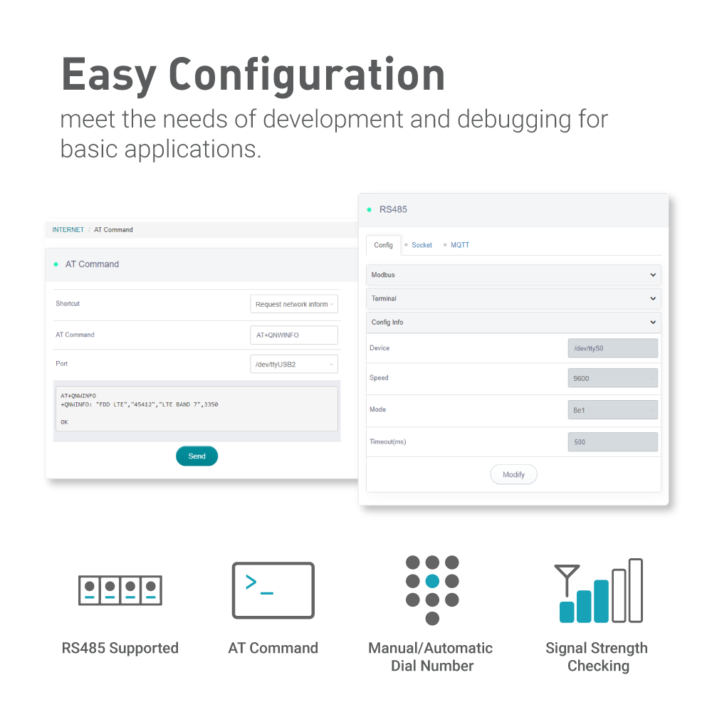 • Easy Configuration: Supports AT command, manual/automatic dial number, and signal strength checking in our new admin panel for better management and configuration.
