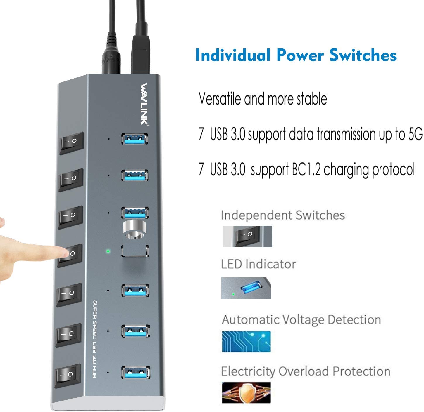 - 【Solid Performance】Featured with sturdy and well-built quality, each port has its own ON/OFF switch so you don’t need to unplug the devices every time you finish using. Hot-Swapping supported. 7-in-1 design, no more clutter on the table.