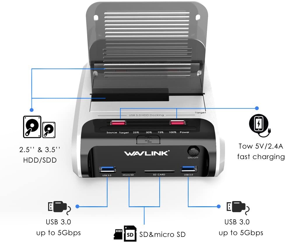 • Dual-Bay 2.5”/3.5” SATA Hard Drive (HDD) & Solid State Drive (SSD) Docking Station;Screw-less and Easy-to-Plug. Integrated SD&TF read slot, 2x USB 3.0 Data Ports and 2x red fast charging Port can charge your smart phone or a tablet up to 2.4A.